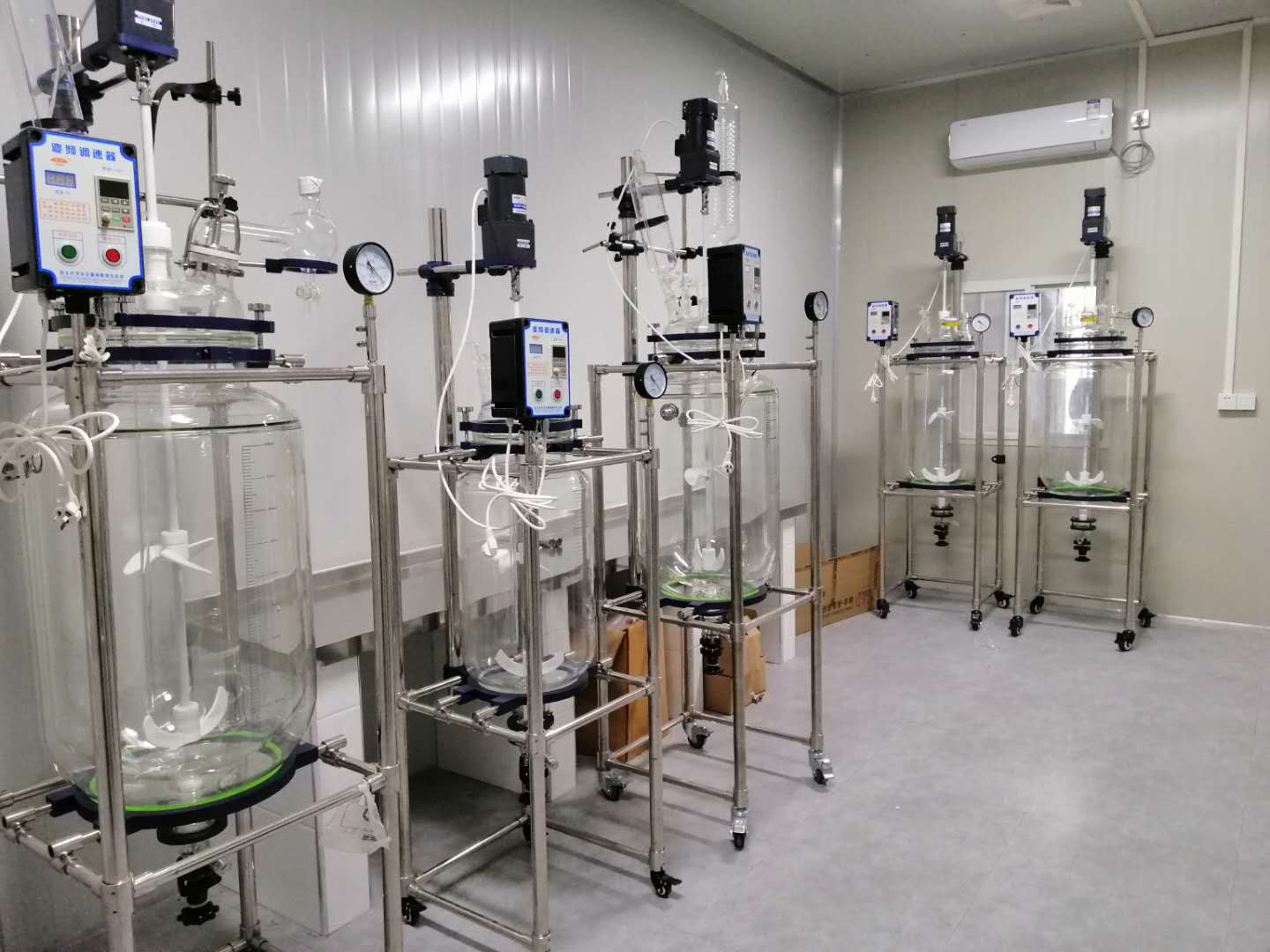 防爆托盤(pán)雙層玻璃反應(yīng)釜+高溫循環(huán)槽安裝現(xiàn)場(chǎng)